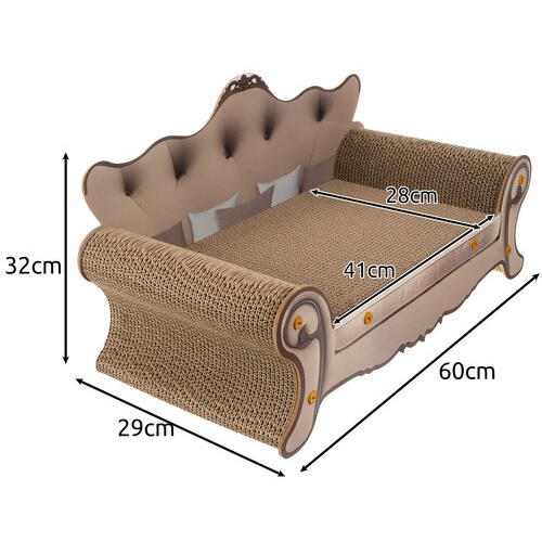 MATERIALE DURABILE ȘI ROBUSTE - zgârierea este realizată din carton presat stratificat de o durabilitate excepțională, care garantează o utilizare pe termen lung. Cartonul ondulat este ideal pentru ascuțirea ghearelor, satisfacând nevoile de zgâriere ale pisicii tale, protejând în același timp mobila de casă de deteriorare. Spatele și fața patului imită o canapea antică și sunt realizate din plăci MDF de înaltă calitate, care conferă întregului aspect elegant și asigură soliditatea structurii.