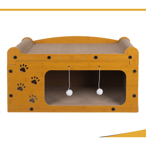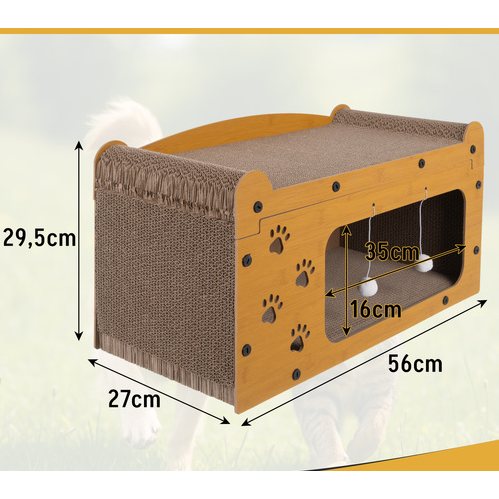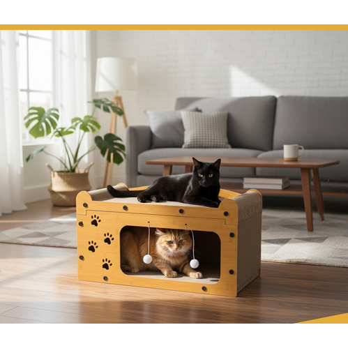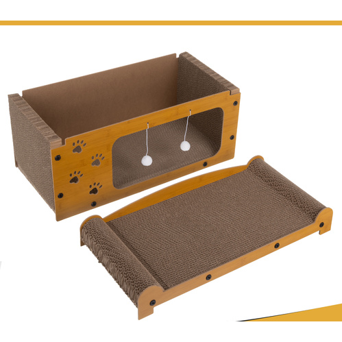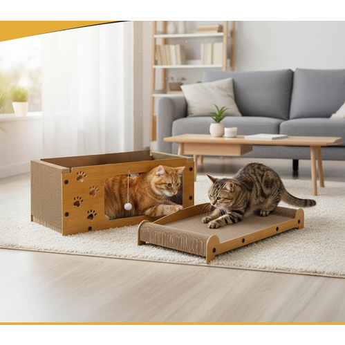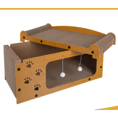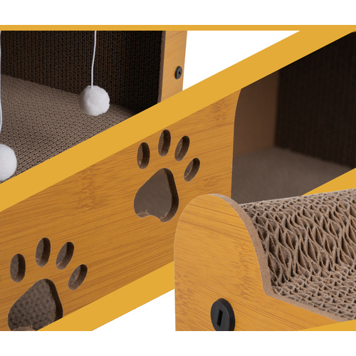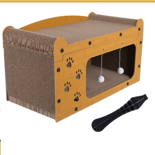 Fabricat din lemn HDF durabil si materiale ecologice, produsul este sigur pentru animale si prietenos cu mediul. Suprafata de zgariat din carton ondulat de inalta densitate ajuta la intretinerea sanatoasa a unghiilor si la reducerea stresului pisicii, oferind in acelasi timp o textura placuta si rezistenta la uzura. In partea superioara, zona moale si stabila functioneaza ca pat de odihna sau punct de observatie preferat al pisicii.
