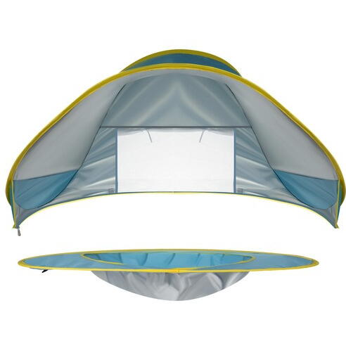 Cortul de plajă semideschis POP UP cu piscină este o combinație grozavă de umbrelă și paravan cu piscină, dar este mult mai convenabil de utilizat și ocupă mult mai puțin spațiu, ceea ce este important atunci când împachetați bagajele. Protejează împotriva vântului și a soarelui excesiv. Acest lucru este important dacă mergeți la plajă cu copii și doriți să le oferiți o odihnă în siguranță. Piscina este construită în partea de jos a cortului. Sapă o groapă, toarnă apă și copilul se poate stropi.