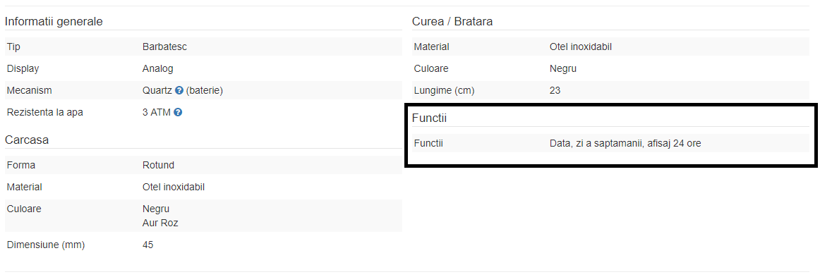 Daca subcadranele sunt functionale veti vedea specificatiile produsului afisate la rubrica "Functii", precum in exemplul de mai jos. Daca subcadranele/orice alte functii sunt doar de decor rubrica "Functii" nu va exista pe pagina produsului.
