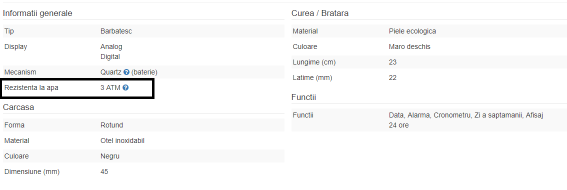 Rezistenta la apa a ceasurilor este specificata pe pagina de produs sub denumirea "Rezistenta la apa" - asa cum se vede in poza de mai jos.