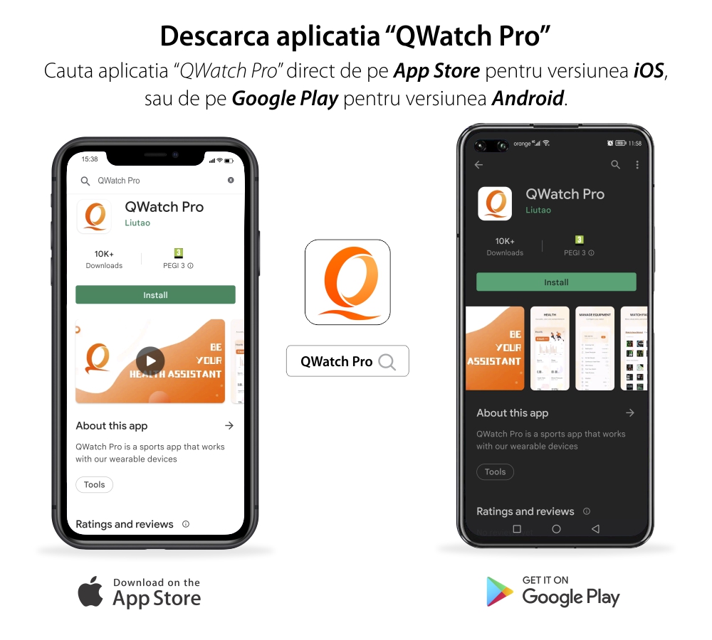 Descarcati gratuit din magazinul Play (Android) sau App Store (iOs Apple iPhone) aplicatia QWatch Pro pentru a beneficia de toate avantajele bratarii. Nu intotdeauna aplicatiile dedicate sunt si in limba Romana. De cele mai multe ori acestea vin cu limbi de circulatie internationala (exemplu: Engleza, Franceza, Spaniola, etc). Pentru a verifica daca aplicatia este in lb. Romana o puteti descarca si verificati daca exista varianta in lb. Romana.