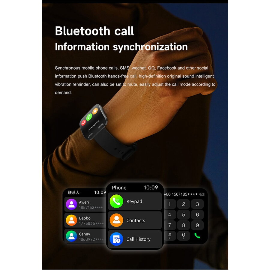 Sincronizati telefonul cu bratara si veti putea stabili ce tip de notificare sa afiseze (apel, sms, facebook, messenger, whatsapp, etc), veti putea monitoriza printre altele istoricul activitatilor sportive (pentru sporturile incluse in softul ceasului -> daca exista acesta functie), pulsul (daca produsul are functia), tensiunea arterial (daca produsul are functia), orele de somn si calitatea acestuia (daca produsul are functia).